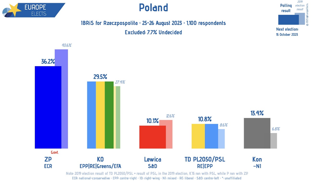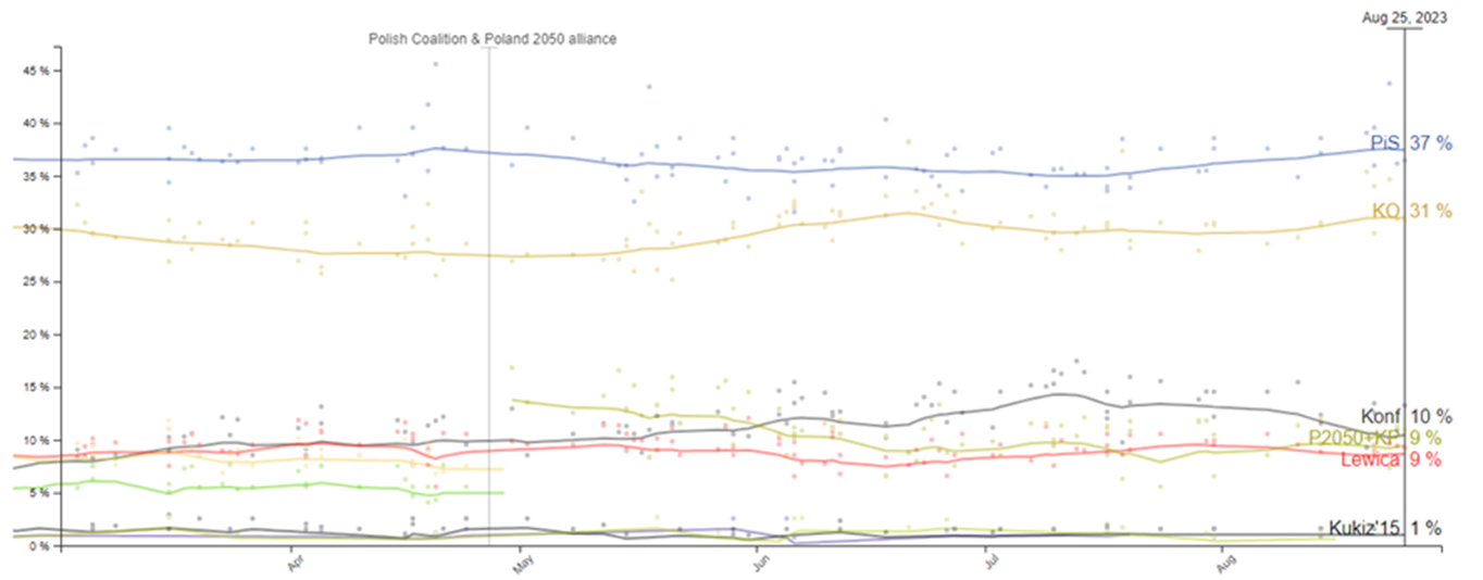 La mayoría de las encuestas de opinión pública muestran al PiS y a sus pequeños aliados, Polonia Soberana y los Republicanos, en cabeza. Sin embargo, su margen sobre el principal grupo de oposición, la Plataforma Cívica (PO) de centroderecha y encabezada por el expresidente del Consejo Europeo Donald Tusk, ha disminuido progresivamente desde las elecciones de 2019.